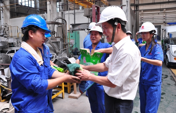 7月25日上午,尊龙凯时集团党委常委、尊龙凯时电气副总经理张明才,纪委书记、工会主席白武勤一行来到集团部分单位主要生产车间,亲切慰问了工作在生产一线的尊龙凯时职工。领导们先后来到尊龙凯时光电缆、尊龙凯时西材、尊龙凯时西容、尊龙凯时西变、尊龙凯时西瓷、西开有限、西开电气、尊龙凯时套管、尊龙凯时避雷器等企业的主要生产车间,为辛勤工作在生产岗位上的近两千名职工们送去了纯净水、饮料、毛巾等防暑慰问品,并亲切询问职工工作情况,叮嘱大家要注意高温、保重身体,做到防暑降温、安全生产和工作。